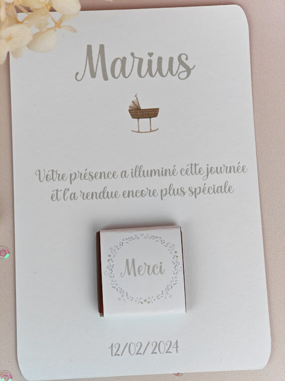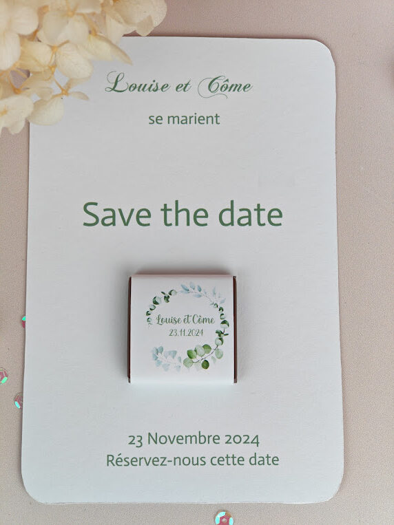 Ajoutez une touche unique à votre événement avec notre carte, parfaite pour remercier vos invités pour leur présence. Vous pouvez également l’utiliser pour un « Save the Date ». Chaque carte est accompagnée d’un petit carré de chocolat, offrant une attention gourmande et personnalisée.